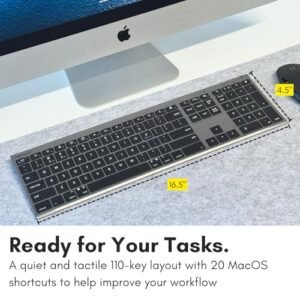 - 𝗤𝘂𝗶𝗲𝘁. 𝗥𝗲𝗳𝗶𝗻𝗲𝗱. 𝗮𝗻𝗱 𝗦𝗮𝘁𝗶𝘀𝗳𝘆𝗶𝗻𝗴: The mac wireless keyboard is equipped with 110 scissor flex keys that include 20 MacOSX shortcuts and a numeric keypad. Each keystroke will be quiet and smooth.