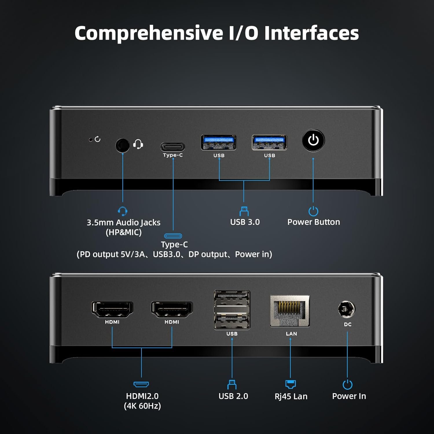 - 24EUs UHD Graphics & Dual Display: Mini pc has an Intel UHD Graphics up to 750 MHz with 24EUs (the N95 has 16 EUs). providing powerful graphics performance. It also features 2*HDMI2.0 and 1*Type-c interfaces. supporting dual displays can be connected at the same time. greatly improving work efficiency.