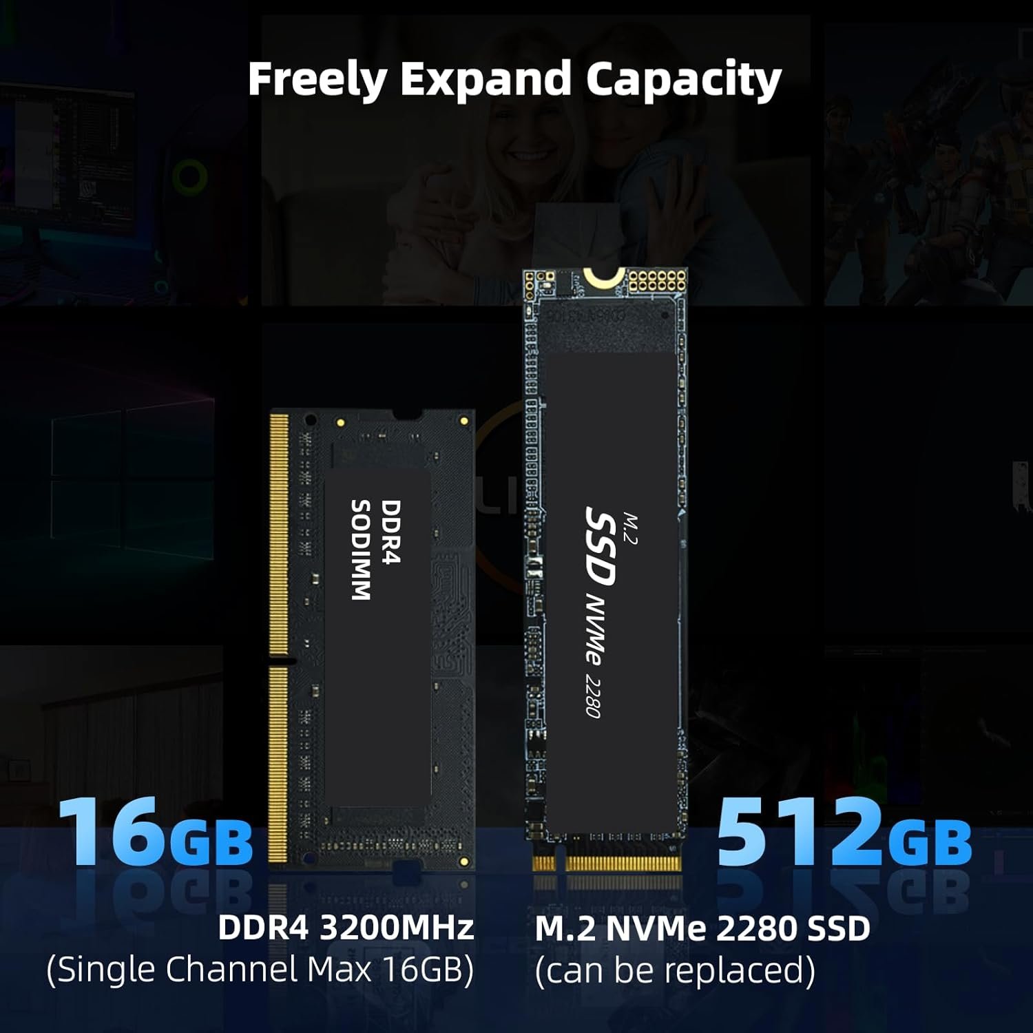 - High Capacity & Expandable: The mini PC has built-in 16GB of single-channel DDR4 RAM and a 512GB M.2 2280 NVME PCIEx4 SSD (40% faster than Gen3. up to 2TB). Our mini desktop PC boots up in seconds. runs multiple software applications and transfers files quickly.