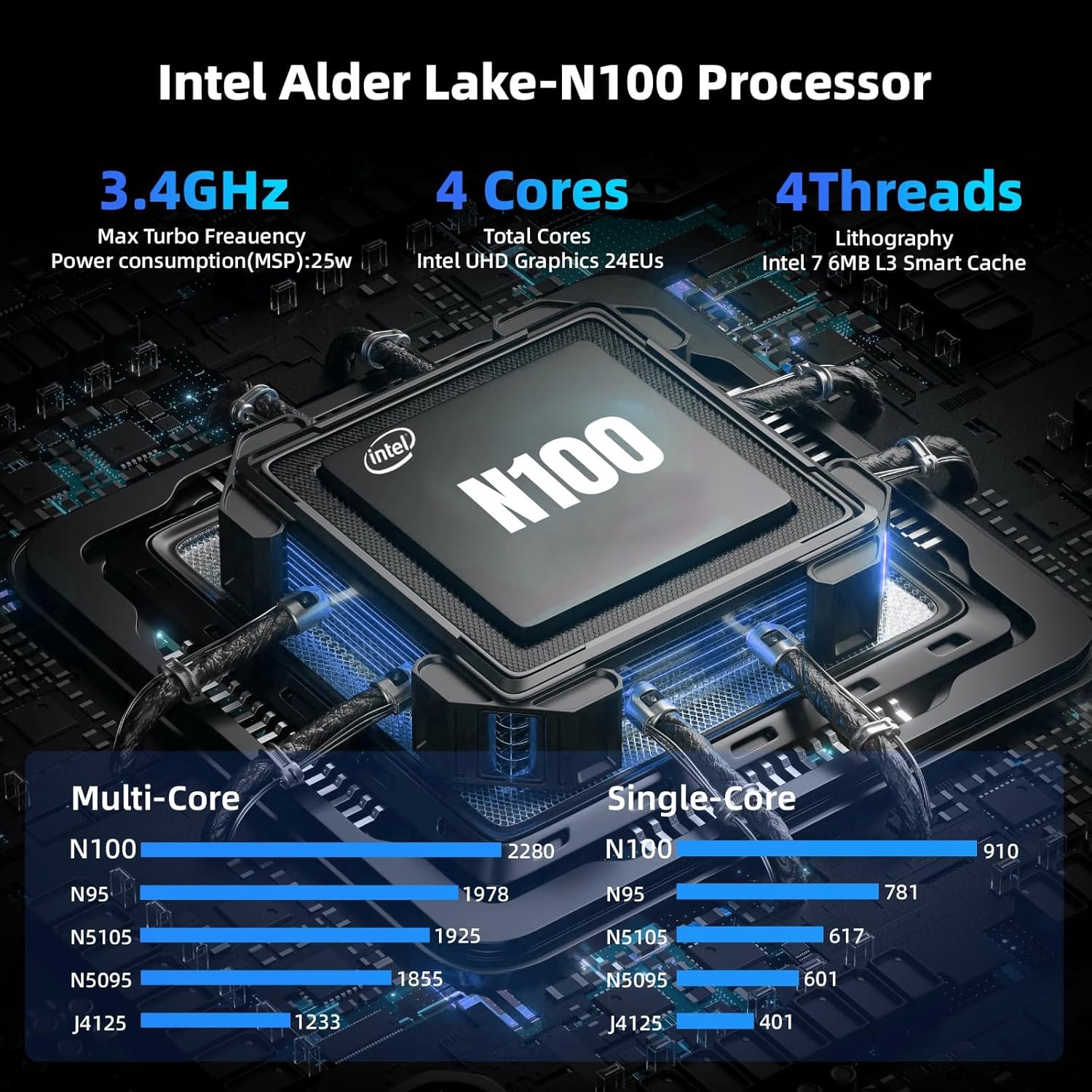 - Powerful Intel N100 Processor: DEXARIS mini PC is powered by 12th gen Intel AIder Lake N100 (10nm) processor (4 cores. 4 threads. 6M cache. up to 3.4GHz). 6W TDP. Performance is up to 39% faster than N5105. A fast. smooth and power-saving mini computers for daily productivity and entertainment needs. Perfect for home. business. school. office.
